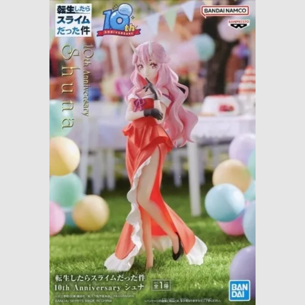 Celebrate the 10th anniversary of That Time I Got Reincarnated as a Slime with this special edition figure of Shuna. Elegantly dressed in a commemorative outfit, Shuna is captured in a graceful pose with intricate detailing in her clothing and hair. A beautiful tribute to the beloved character, perfect for longtime fans of the series.